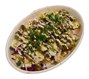A golden fried falafel served in a freshly fried wrap bowl, layered with crisp salads. Finished with creamy hummus, drizzles of tahini, and a touch of fresh herbs. A vibrant, satisfying dish that’s as colorful as it is delicious.